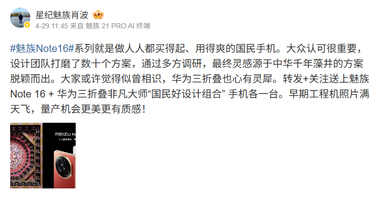 4月29日,星纪魅族中国区总经理肖波发布微博,解释魅族Note 16经过多方调研,设计源于中华千年藻井,并称华为三折叠也“心有灵犀”,更是在文末直接抽送魅族Note 16与华为三折叠。